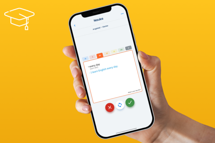 W ustawieniach można również zdecydować, czy fiszka ma się obracać z animacją, czy – bez niej (wyborem domyślnym jest animacja). Czemu służy ta funkcjonalność? Widoczny obrót fiszki pokazuje moment przejścia z awersu na rewers i tym samym daje impuls do “przełączenia” się z pytania na odpowiedź. Dla niektórych jest to też miły efekt, który sprawia, że nauka jest przyjemniejsza. Są jednak użytkownicy, którzy rezygnują z animacji – szybsze przejście z pytania do odpowiedzi pozwala im skupić się tylko na treści. Wybierzcie zatem tę opcję, która najlepiej pasuje do Waszego stylu nauki!